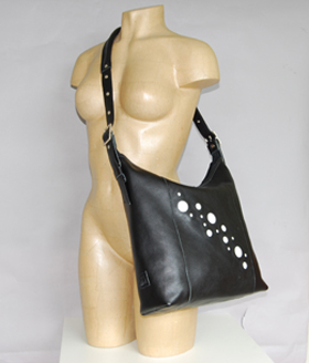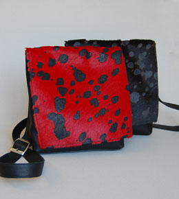 En stund jobbet jeg endel med kuskinn med hår. Veskene blir alle forskjellige, da skinnene er unike fra dyr til dyr. Denne modellen heter Linje.