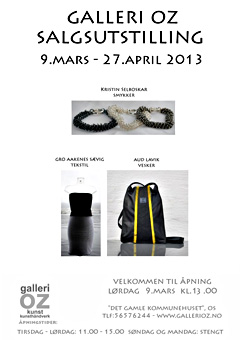 | Veske vist på Os-utstillingen i mars 2013.  | Plakat til utstillingen.   | Gro Aakenes Sævig viste kjoler. Kristin Selboskar viste smykker og jeg som viste vesker. |