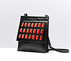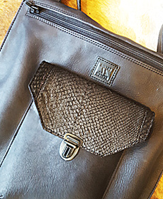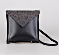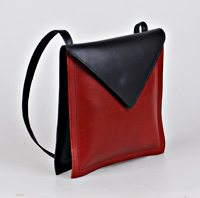 | Modell Kvadrat. En gammel modell som jeg har tatt frem igjen. En enkel og elegant veske. En modell jeg er stolt av.   |  | Denne modellen lager jeg i mange fargevarianter. Som her med fiskeskinn på lokket. Se også små vesker.   |