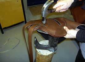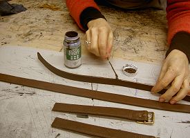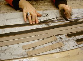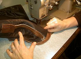 Bunnen blir sydd i, og foret med stivt og tykt lær for at fasongen skal holde seg |