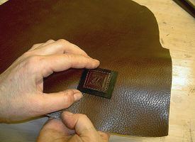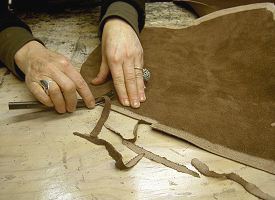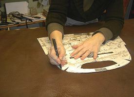 Mønsterdelene blir plassert på skinnet. Dyrehuder har alltid sår og små og store skjønnhetsfeil. og når mønster legges på, må skinnet utnyttes best mulig. |